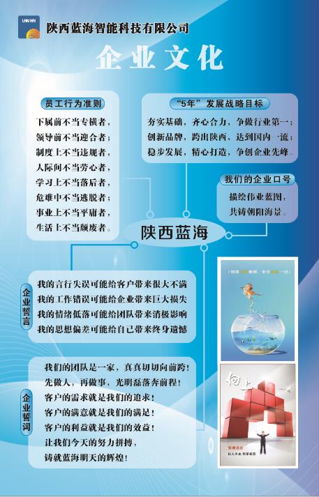 随着公司规模的增大、员工数量的增多,近日公司对企业文化进行更新。此次企业文化强调个人素质的提升,从细节着手,具备忧患意识,上下同心,相互监督,真正将蓝海的企业文化融入日常生活中,全面提升蓝海同仁综合素质。