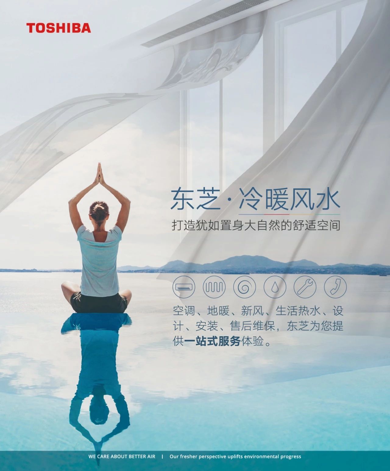 东芝空调推出的“冷暖风水”一站式服务。产品包括全变频直流无刷空调、热泵采暖系统、新风系统及自然冷媒[CO2]热泵热水机,一站式为用户消除产品方案顾虑,简化安装沟通环节,解决售后服务问题。